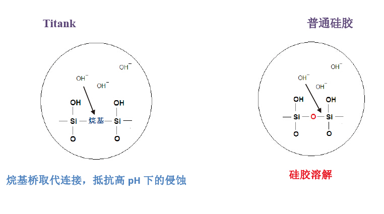 Titank 系列有機硅膠雜化基質,是在硅膠的硅氧烷網狀構造中以更加穩定的烷基來取代在堿性條件下不穩定的硅氧橋連接,使其既具有硅膠類填料的良好分離性能和機械強度,又有聚合物填料的耐堿性。