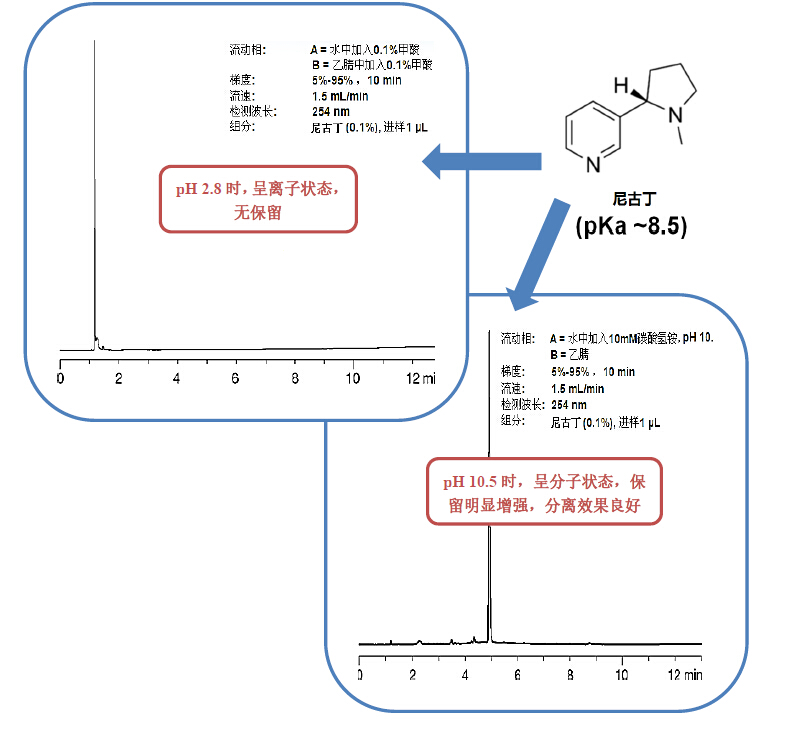 我們知道,分子的離子狀態由流動相的pH決定,因此,調整流動相 pH 能夠有效調節具有電離官能團的分析物的保留行為。