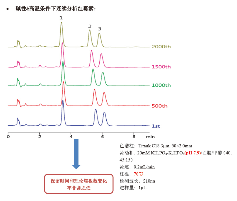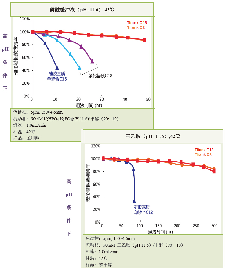 從以上兩組數據可以發現,在強堿或高溫等苛刻條件下的 Titank C18/C8 的色譜柱壽命,都遠在市售高耐堿性柱和普通硅膠基質ODS柱之上。