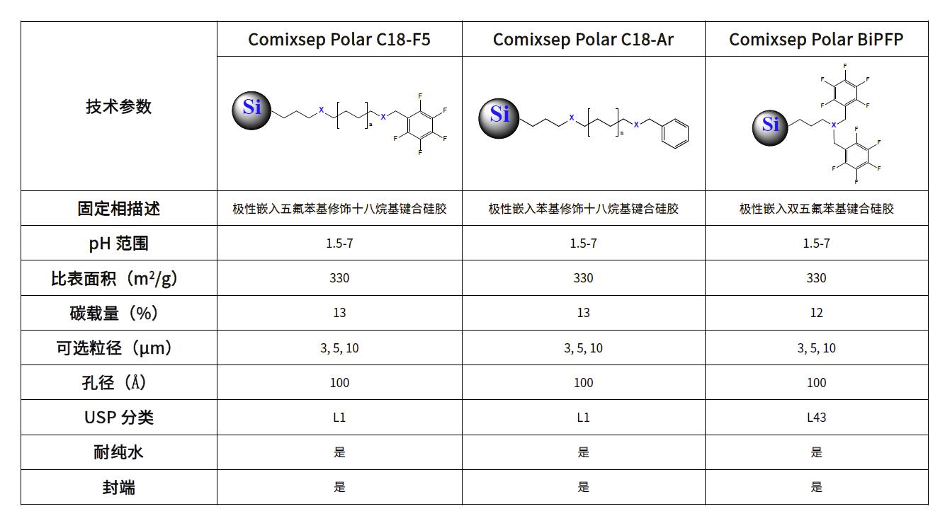 菲羅門公司的Comixsep系列為創(chuàng)新的混合作用(Mixed-mode)液相色譜柱,通過在碳鏈上嵌入極性基團和芳香基團,使色譜柱兼具疏水作用、極性作用和π-π作用從而具有與常規(guī)C18不一樣的獨特選擇性,非常適合用于HPLC分析方法開發(fā)。