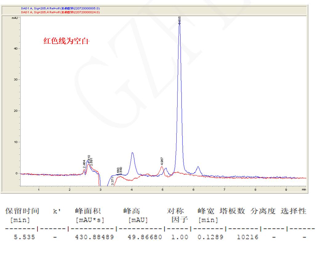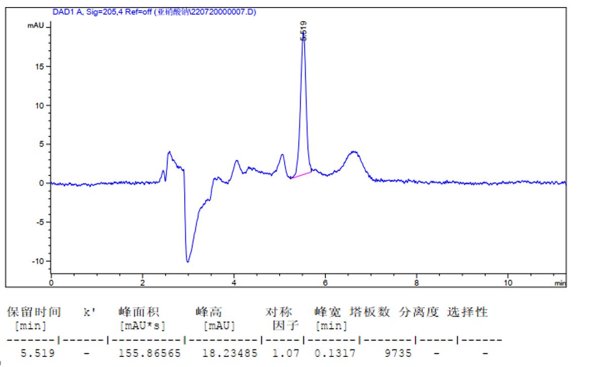 Comixsil RP-AX 在 HPLC+UV 體系,可以輕松分析亞硝根限度至 1ug/ml。根據(jù)結果,獲得極佳峰形與很好柱效,實際限度可以更低(因實際需求未再考察)。(案例中雜峰因樣品純度引起)。