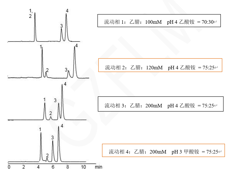 * 流動相的選擇:通過試驗不同的溶劑系統(tǒng)和比例,找到能夠同時分離這四種物質(zhì)的最佳流動相。 * 柱溫和流速的調(diào)整:根據(jù)物質(zhì)的保留行為和分離效果,調(diào)整柱溫和流速以優(yōu)化分離效果。 * 檢測波長的選擇:如果采用紫外檢測器,需要選擇適合待測物質(zhì)的檢測波長。