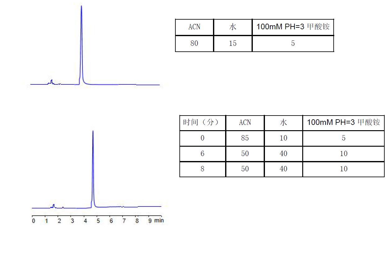 說明:以上應(yīng)用可以簡單在酸性體系下分析尼古丁。如果是用于MS 檢測器??蛇x擇Comxsil HAC 3u 50*2.1mm(P/N:FMB-HAC3-BONU)柱,0.2ml/min, ACN:5mM PH=3 甲酸銨=85:15,預(yù)計2min 出峰分析完畢。 該方法可避免C18 柱酸性條件下的弱保留,拖尾;避免Hilic 柱酸性條件下的重現(xiàn)性問題,避免不喜歡用堿性條件的客戶群體。如果愿意用堿性體系的,菲羅門公司的Titank C18 柱,ACN 與碳酸氫銨的體系,也可以很好分析尼古丁,可向銷售代表索取應(yīng)用。 |