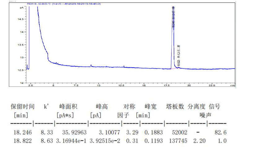 App ID: FLM-F250002 FBX-DEX DET Gamma 氣相手性柱對(R,S)-1,2-丙二醇的手性分離 色譜柱:FBX-DEX DET Gamma 30m×0.25mm×0.25μm 貨號:GDET-025-025-30 色譜條件:咨詢 樣品:(S)-1,2-丙二醇和(R)-1,2-丙二醇,甲醇稀釋為濃度0.1%樣品 進樣量:0.04μL 色譜圖(1):S 構(gòu)型先出峰,R 構(gòu)型后出峰,分離度2.88。R 與S 1:1 配比