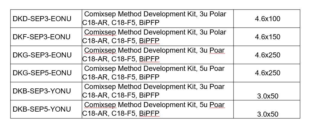 Comixsep復合反相固定相方法包為三款規(guī)格一致的互補固定相(Polar C18-F5, Polar C18-AR和Polar BiPFP)的組合,通過選擇性的科學互補,方便在HPLC方法開發(fā)時固定相的篩選,最大化提升方法開發(fā)的效率和成功率,是HPLC方法開發(fā)的有力工具。