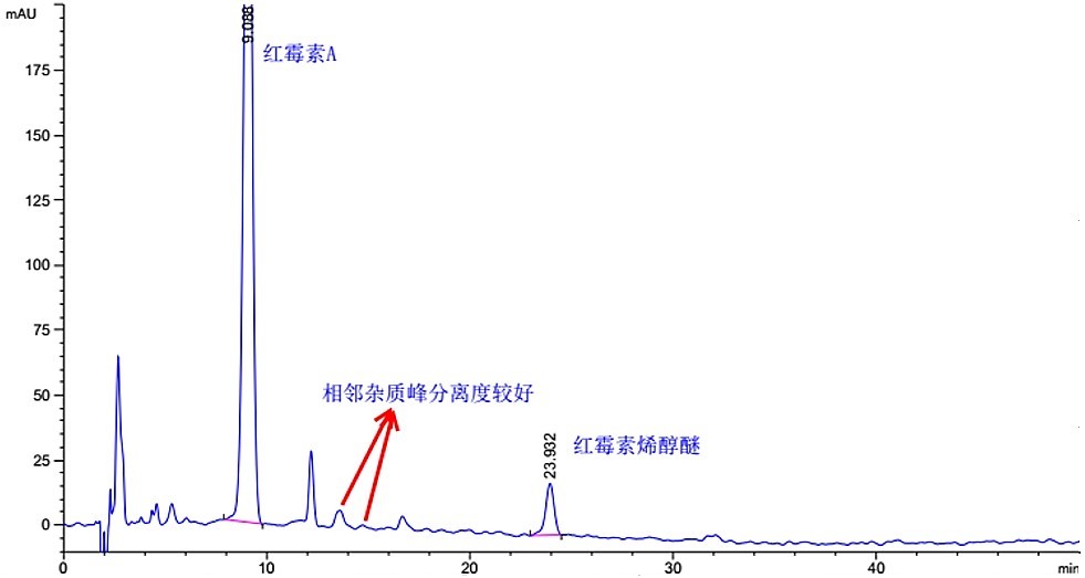 注:該方法要求紅霉素 A 峰與紅霉素烯醇醚峰的分離度應大于 14.0,紅霉素 A 峰的拖尾因子應小于。