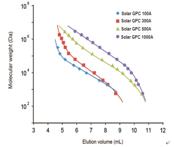 • Solar系列脂溶性GPC/SEC色譜柱 Solar系列體積排阻色譜柱,以高交聯度的聚苯乙烯/二乙烯苯(PS/DVB)顆粒為基質,具有極窄的粒徑和孔徑分布,使分析中保留時間與分子量具有準確的線性關系。高交聯度的多孔顆粒具有優異的化學和物理穩定性,因此在更換有機溶劑時可以使分子量校正曲線的形狀和色譜柱的柱效幾乎保持不變。